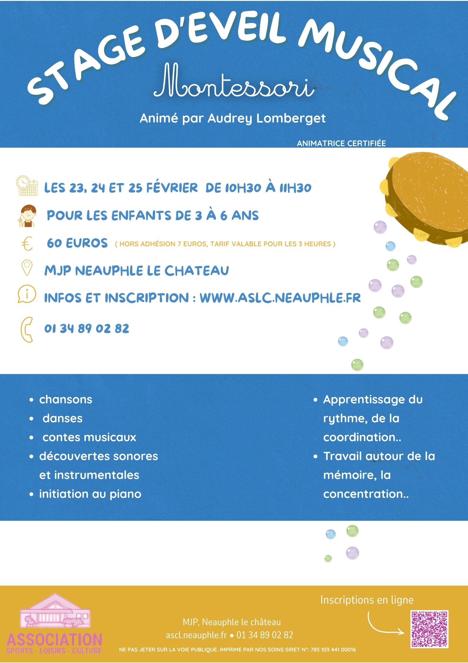 Du 23 au 25 février 2026, Audrey Lomberget sera à nouveau parmi nous pour animer chaque jour une séance d’1 heure d’éveil musical destinée aux enfants de 3 à 6 ans. Animatrice certifiée Montessori, elle accompagnera les enfants dans une première découverte de la pratique musicale et du travail du rythme. Ils exploreront différents instruments et leurs sonorités, dans un cadre bienveillant, en compagnie d’une professionnelle certifiée et passionnée.