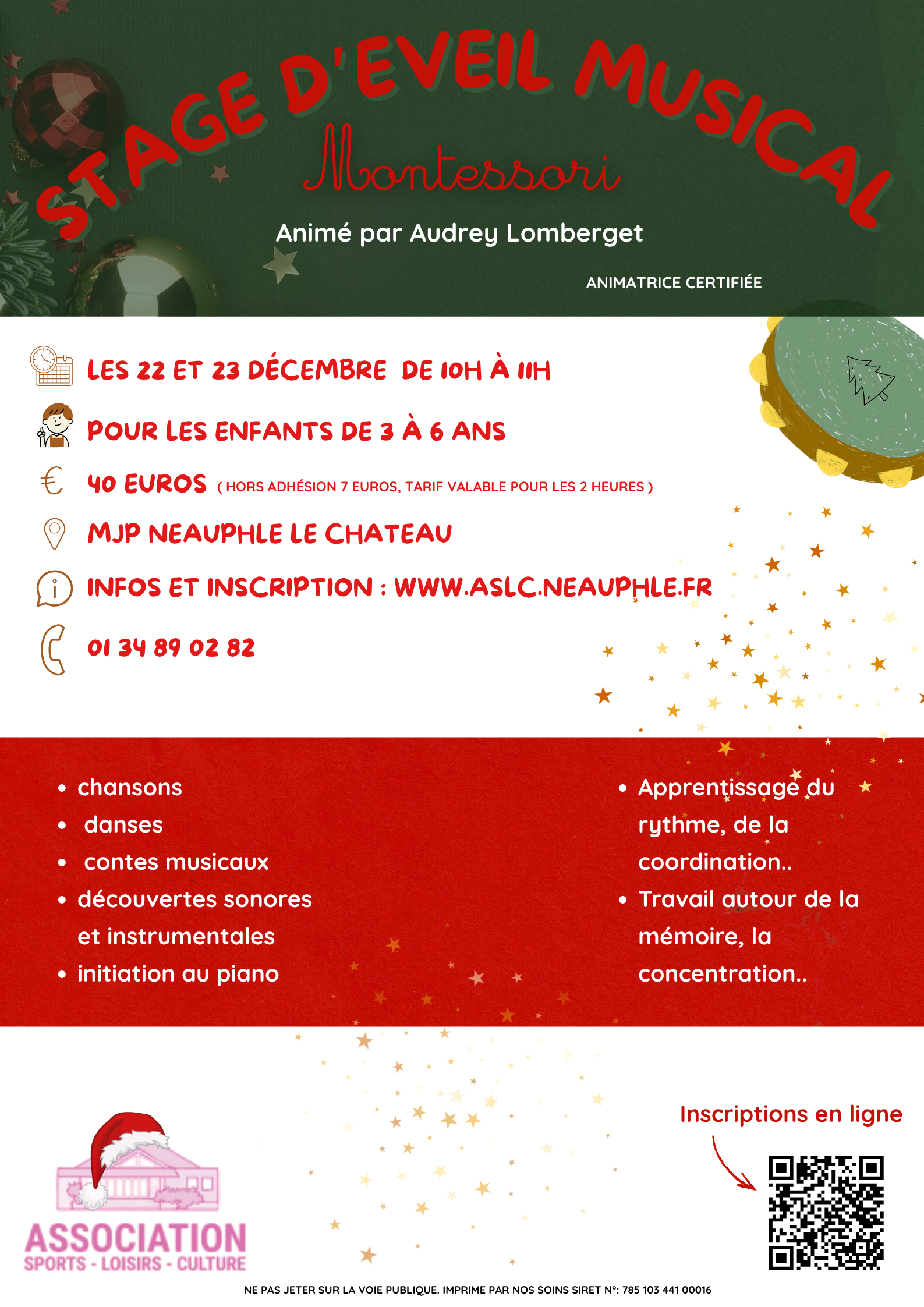 Les 22 et 23 décembre 2025, Audrey Lomberget accueillera vos enfants de 3 à 6 ans le lundi et le mardi de 10 h à 11 h. Elle leur proposera un atelier d'une heure au cours duquel vos enfants s'initieront à la pratique musicale, au travail du rythme...