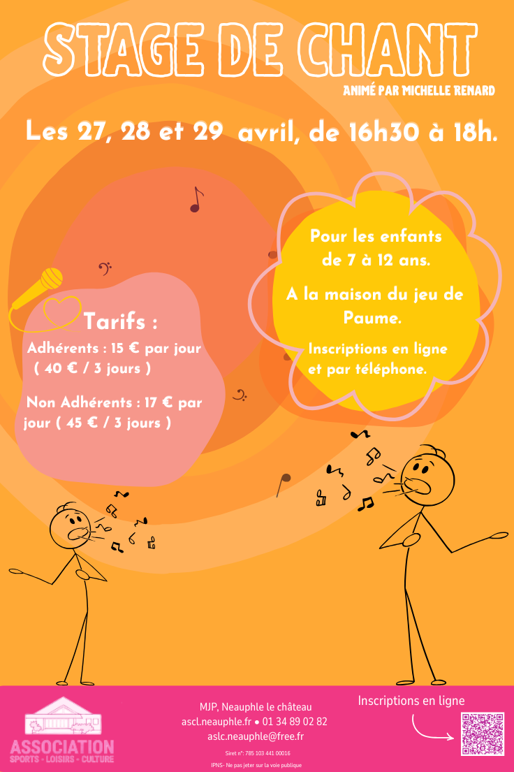 Du 27 au 29 avril, de 16h30 à 18h00, Michelle Renard ( Les chants des possibles ) accueillera les enfants de 7 à 12 ans. Un stage pour les passionnés, les curieux, les novices, tous ceux qui souhaitent découvrir leurs voix et passer un beau moment autour de la musique et du chant.
